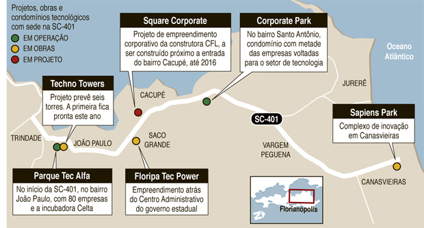 Segunda atividade econômica que mais arrecada impostos em Florianópolis, o setor de tecnologia cresce, em média, 20% ao ano. A expansão está, agora, quebrando os limites dos prédios comerciais do Centro e mudando a paisagem. A exemplo do Vale do Silício, que cresceu às margens da estrada El Camino Real, na Califórnia, o polo da Capital encontrou terreno fértil na SC-401, que liga o Centro ao Norte da Ilha.