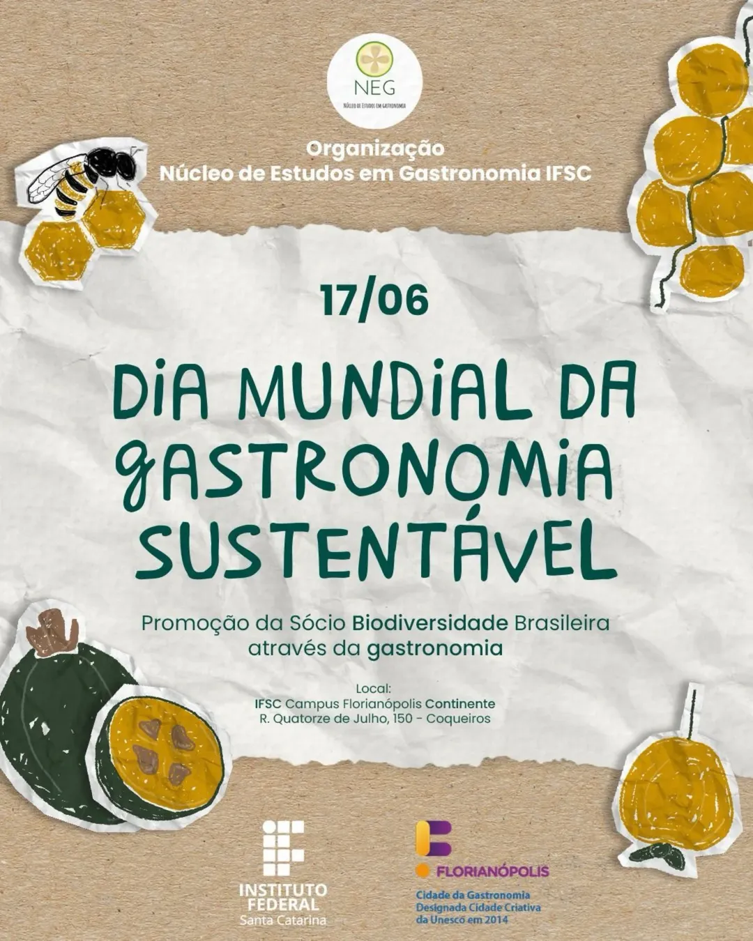 Nesta terça-feira, 17 de junho, a FloripAmanhã participou da programação especial realizada pelo Instituto Federal de Santa Catarina (IFSC), em comemoração ao Dia Mundial da Gastronomia Sustentável. O evento, promovido pelo Núcleo de Estudos em Gastronomia, integrou as ações do Programa Florianópolis Cidade Criativa da Gastronomia da UNESCO e teve como foco a valorização da sociobiodiversidade brasileira por meio da gastronomia.