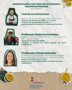– Chef Bruno Demiciano, chef do Villa do Vale Boutique Hotel em Blumenau, com a apresentação “Produtos da Sociobiodiversidade na gastronomia da hotelaria. Um diferencial turístico.”