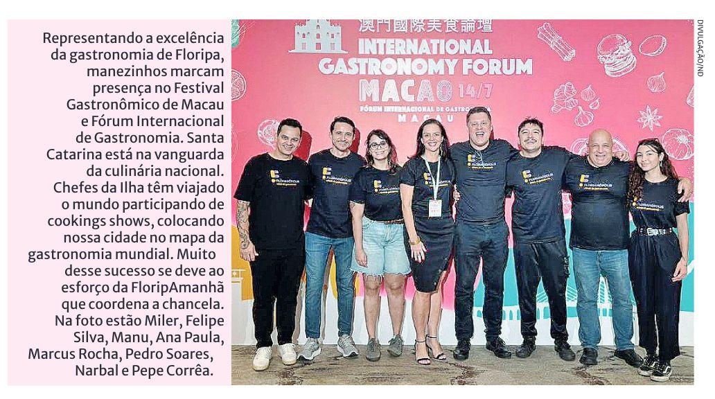 Representando a excelência da gastronomia de Floripa, manezinhos marcam presença no Festival Gastronômico de Macau e Fórum Internacional de Gastronomia. Santa Catarina está na vanguarda da culinária nacional. Chefes da Ilha têm viajado o mundo participando de cookings shows, colocando nossa cidade no mapa da gastronomia mundial. Muito desse sucesso se deve ao esforço da FloripAmanhã que coordena a chancela. Na foto estão Miler, Felipe Silva, Manu, Ana Paula, Marcus Rocha, Pedro Soares, Narbal e Pepe Corrêa.