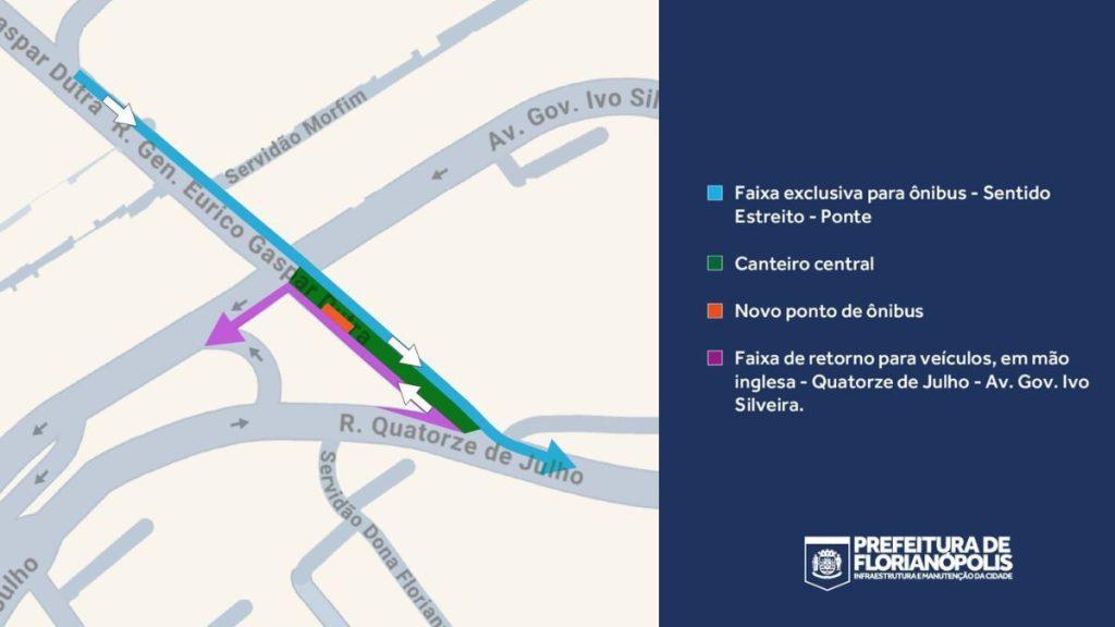 A partir desta segunda-feira (11), começa a funcionar uma nova faixa exclusiva para ônibus no bairro Estreito, em Florianópolis. O trecho fica no fim da Rua General Eurico Gaspar Dutra, no acesso à ponte Hercílio Luz, e terá circulação restrita a veículos do transporte coletivo durante 24 horas por dia, todos os dias da semana.