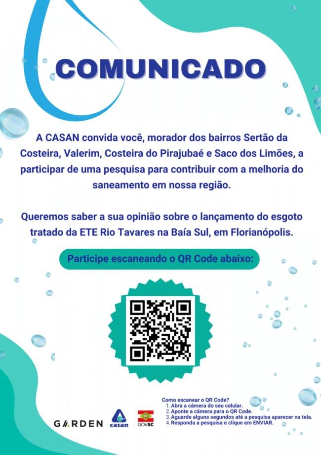 A CASAN (Companhia Catarinense de Águas e Saneamento) realiza até o dia 30 de agosto pesquisa para levantamento da opinião pública sobre o Sistema de Esgoto Sul da Ilha / Fase Rio Tavares.