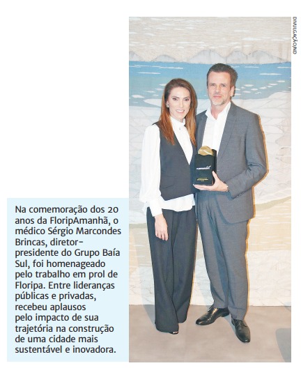 Na comemoração dos 20 anos da FloripAmanhã, o médico Sérgio Marcondes Brincas, diretorpresidente do Grupo Baía Sul, foi homenageado pelo trabalho em prol de Floripa. Entre lideranças públicas e privadas, recebeu aplausos pelo impacto de sua trajetória na construção de uma cidade mais sustentável e inovadora.