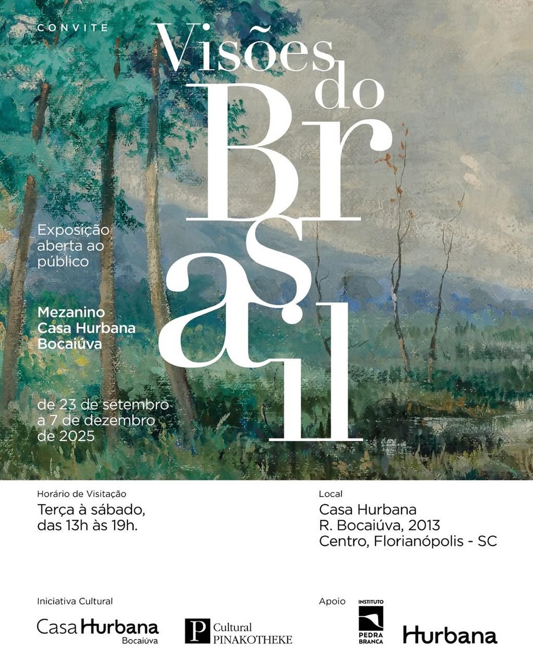 A exposição Visões do Brasil, uma iniciativa cultural da Casa Hurbana e da Pinakotheke Cultural, com a participação da equipe da A.Galeria, nasceu do desejo de compartilhar com Florianópolis uma coleção significativa de arte brasileira, tendo a paisagem como tema central e as manifestações culturais e históricas como eixo curatorial. O evento busca aproximar o público do patrimônio artístico nacional, ao mesmo tempo em que valoriza a memória cultural e incentiva novos diálogos com o presente.