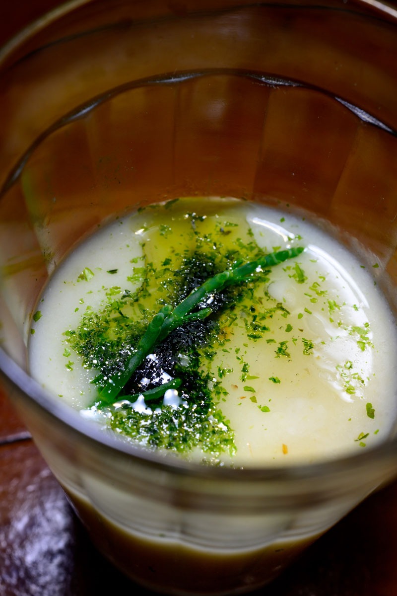 A chef Janete Borges, da Gastroarte Catering, representando a Confraria Sabores de Floripa, preparou uma Vichyssoise (sopa cremosa) do mar, feita com a água da ostra, batatas, alho-poró, creme de leite e servida com ostra defumada, coberta por um pouco de alga marinha (alface-do-mar) seca e um galhinho de alecrim-do-mar, uma halófita, planta resistente à salinidade, com alto valor nutricional e ainda pouco explorada na cozinha regional.