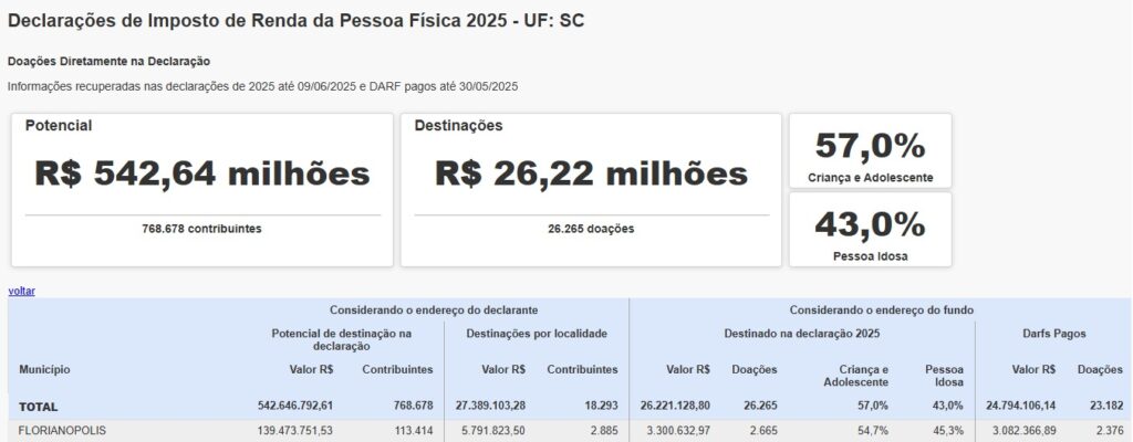 A programação irá destacar um panorama das declarações do Imposto de Renda e do potencial de destinação de recursos em Santa Catarina, com recorte para Florianópolis, mostrando quanto já é efetivamente destinado hoje, o percentual ainda não aproveitado e a comparação com anos anteriores.